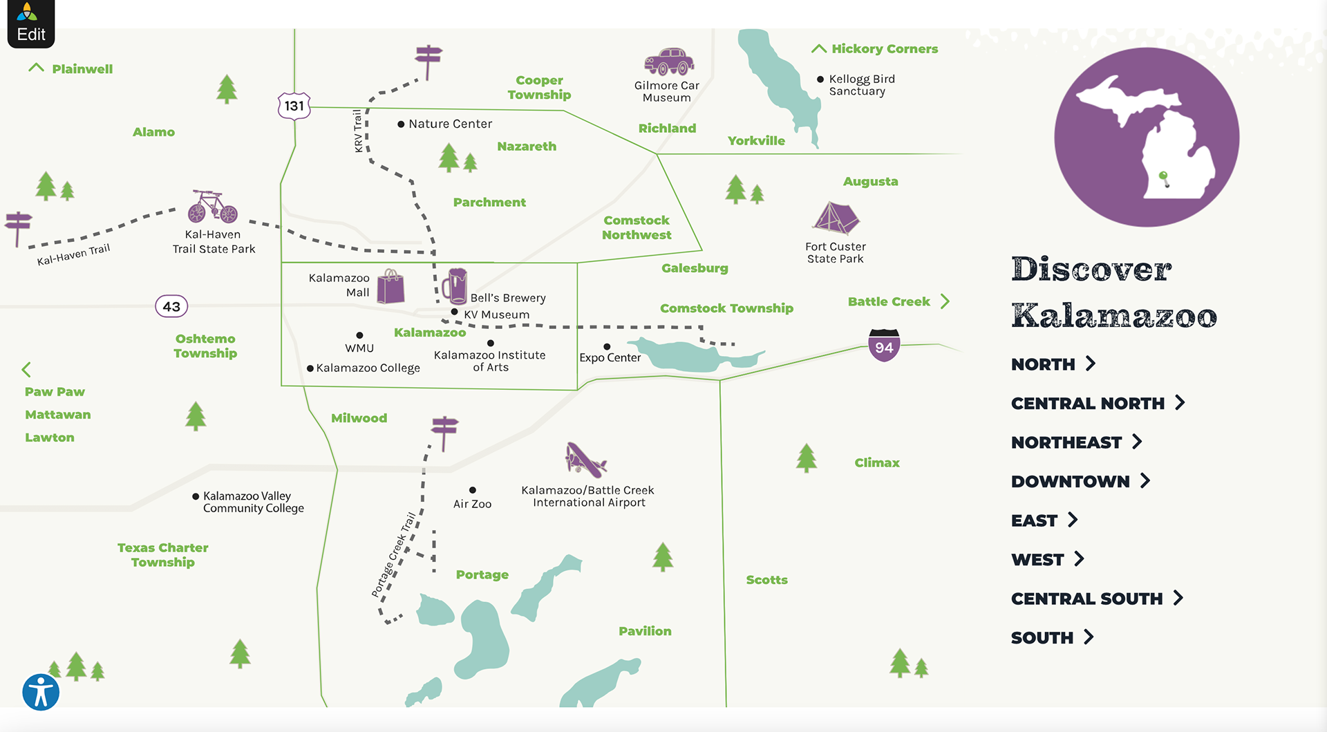 Destination Region Pages — Created engaging “North / Central / Downtown / South” segments with tailored content for each region of Kalamazoo County, providing rich narratives, imagery, itineraries and maps.